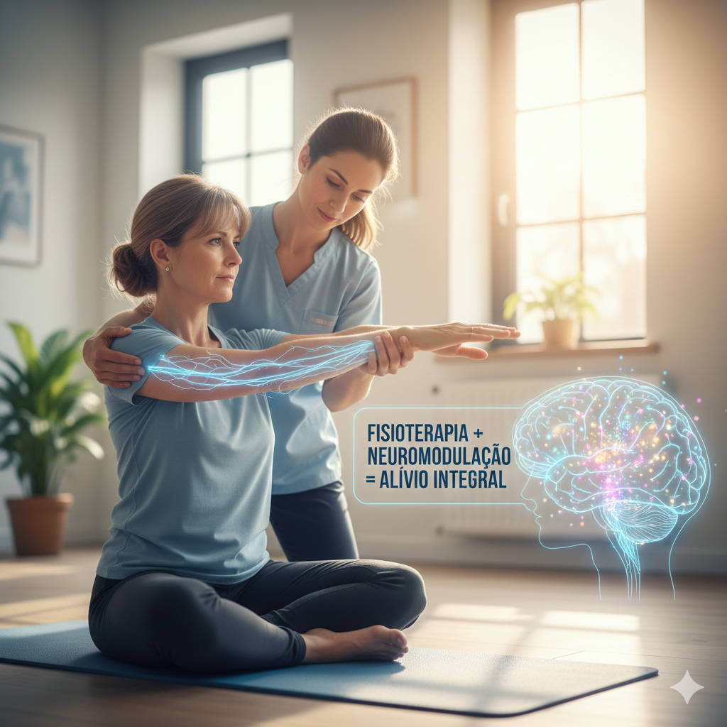 A Janela de Oportunidade: A combinação é a chave. A EMTr prepara o cérebro, melhorando o limiar de dor para que o paciente consiga realizar a fisioterapia com muito mais conforto e eficácia.
